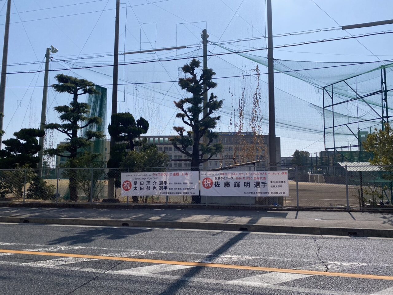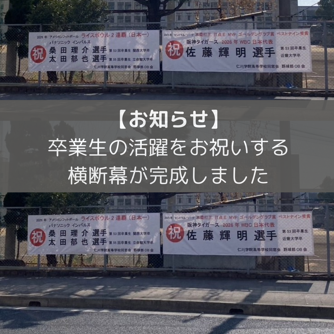 仁川学院高等学校の校内に、このたび卒業生の素晴らしい活躍をお祝いする横断幕が掲出されました。